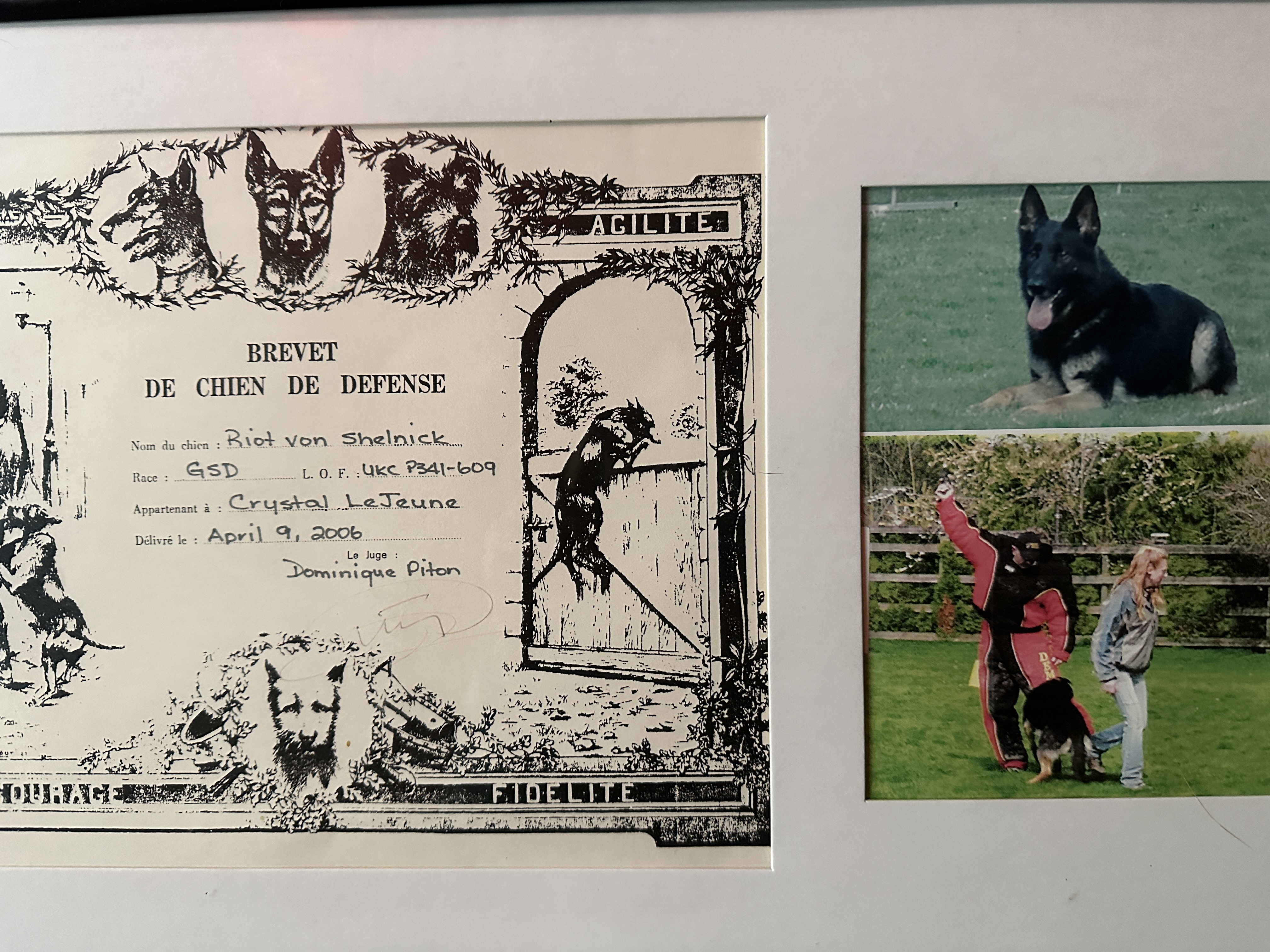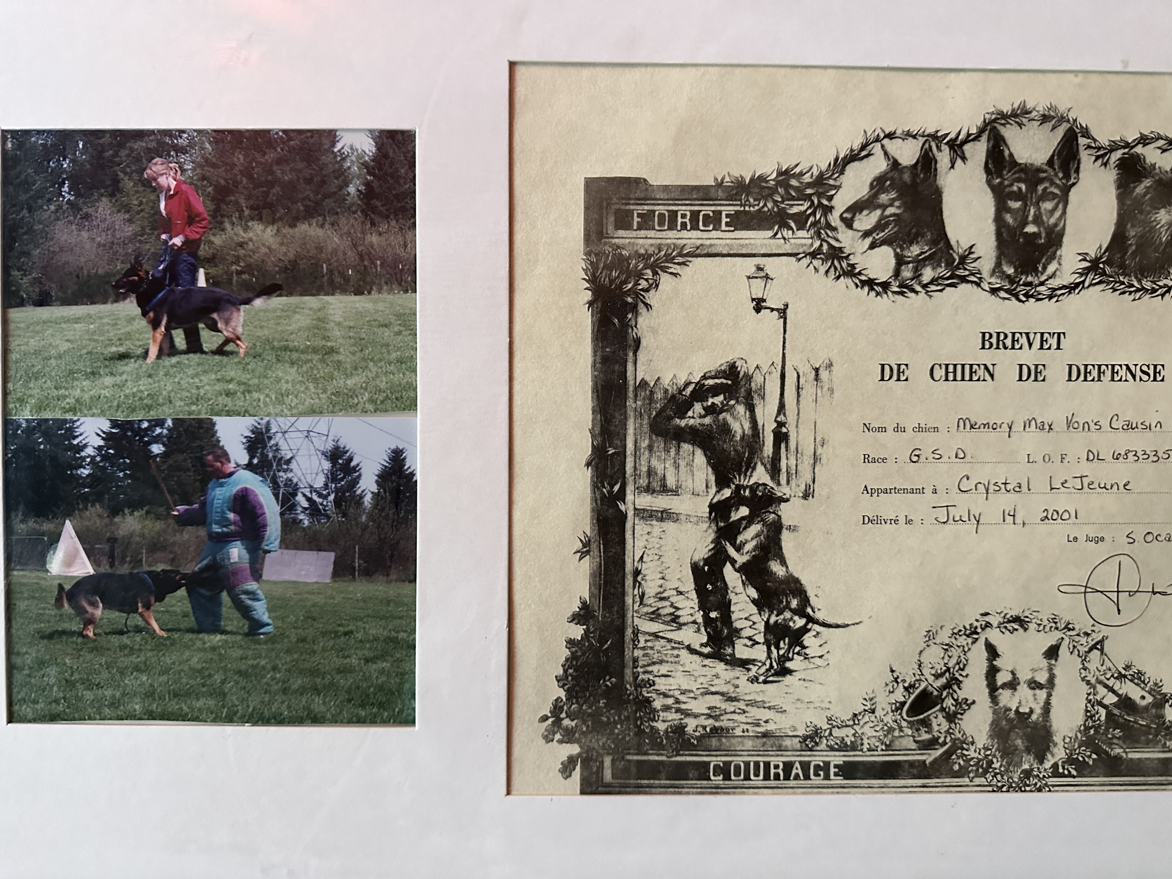 (top) My foundation male Kaos, German Shepherd & I get our certificate of defense in French Ring Sport.