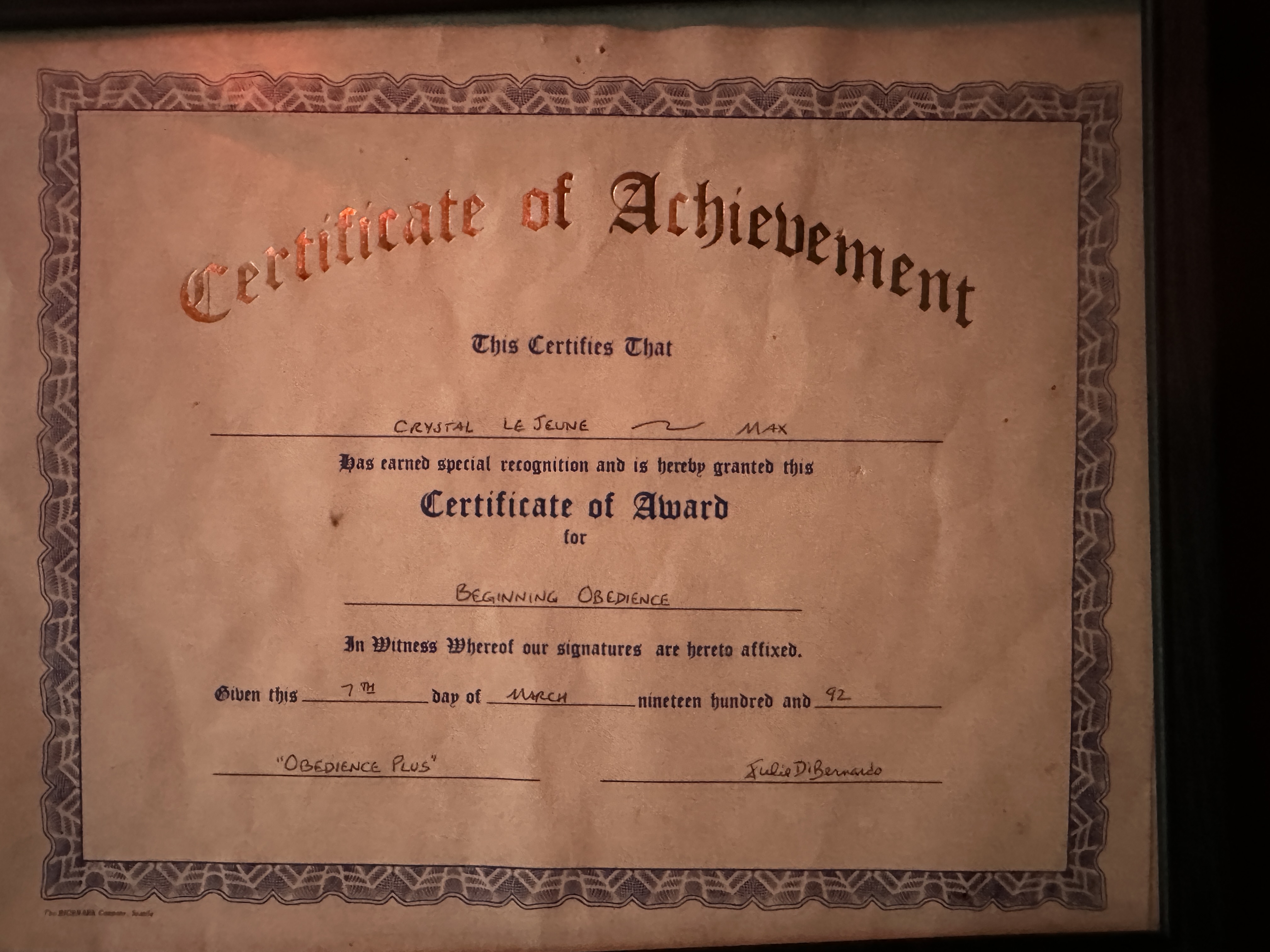 My certificate of obedience training with first German Shepherd-Max.
